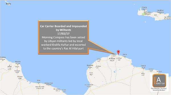 On Friday the 2013-built car carrier Morning Compass was seized by Libyan militants led by local warlord Khalifa Haftar and escorted to the country’s Ras Al Hilal port, according to local media.
