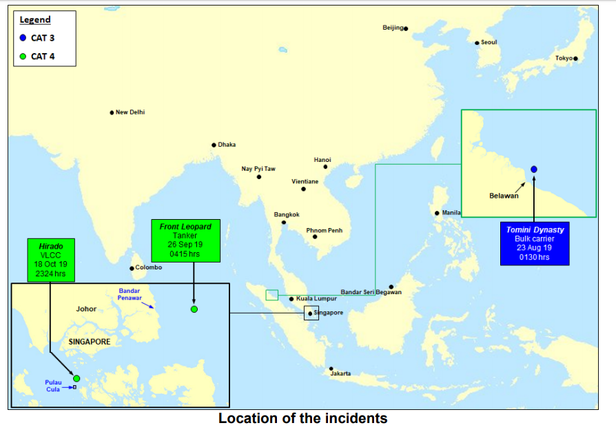 During 15 - 21 Oct 19, three actual incidents of armed robbery against ship in Asia were reported to ReCAAP ISC by ReCAAP Focal Points. One was a CAT 31 incident in Indonesia and two were CAT 42 incidents, one in Malaysia and one in the Singapore Strait. The location of the incidents is shown in the map below; and detailed description is tabulated in attachment.